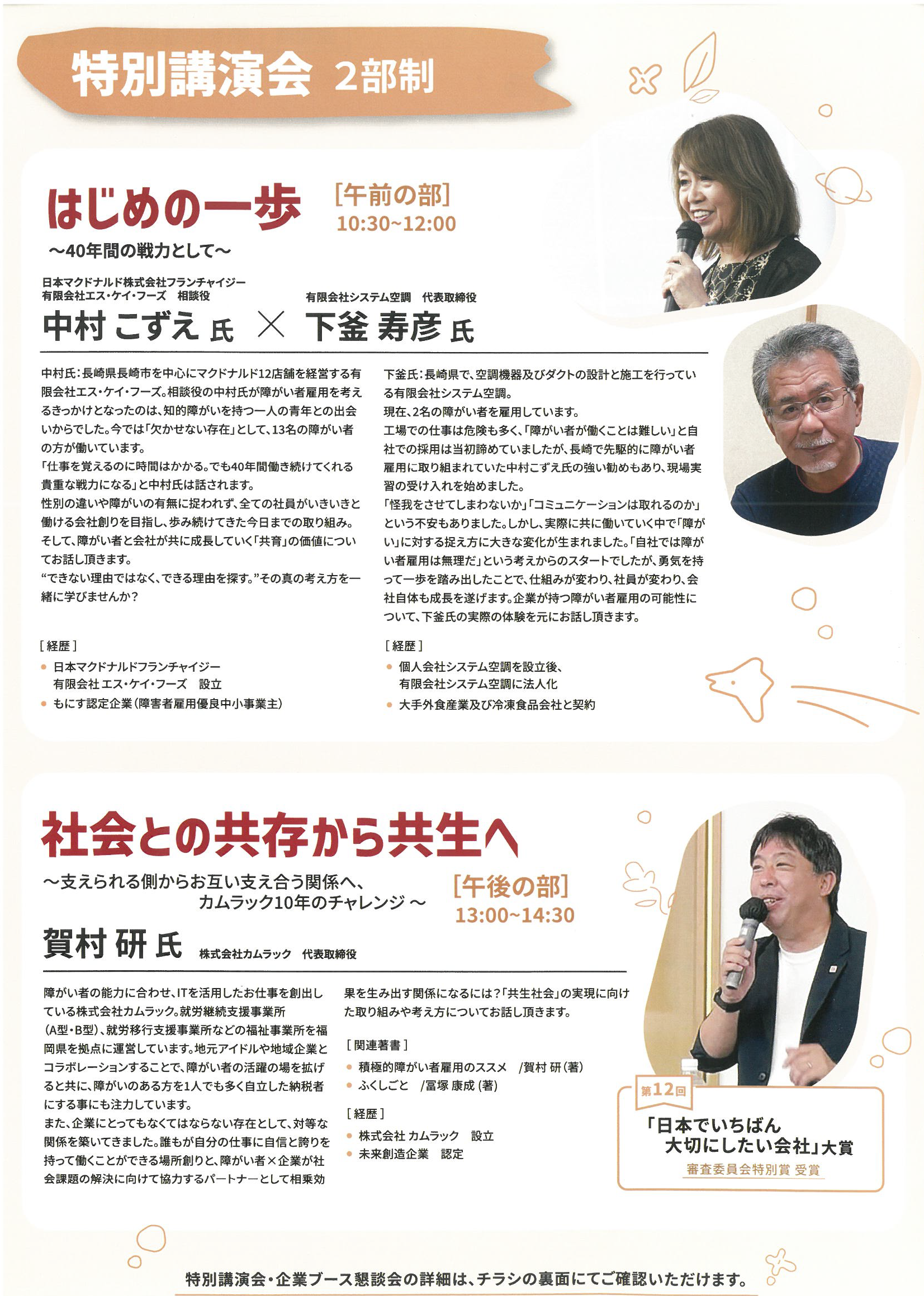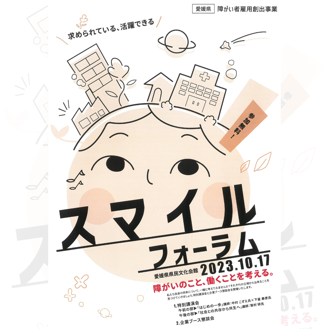 日時:2023年10月17日 場所:愛媛県県民文化会館 (真珠の間) 障がいのある人の就労における不安解消や将来への選択肢を拡げるためのイベント。 福祉事業・企業関係者など分野問わず、誰でも参加できる特別講演会と企業ブース懇談会を実施。 障がい者雇用経験のある講師・企業と話せる貴重な機会。 ご本人様、そのご家族などご参加お待ちしております。 特別講演会の申込はこちら 企業ブース懇談会の申込はこちら