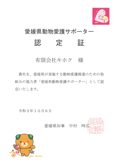 愛媛県が実施する動物愛護に関する周知啓発活動に賛同し協力します。 愛媛県動物愛護サポーター制度 https://www.pref.ehime.jp/h25300/syokunikukennsasidoukakari/doubutuaigosaporter.html