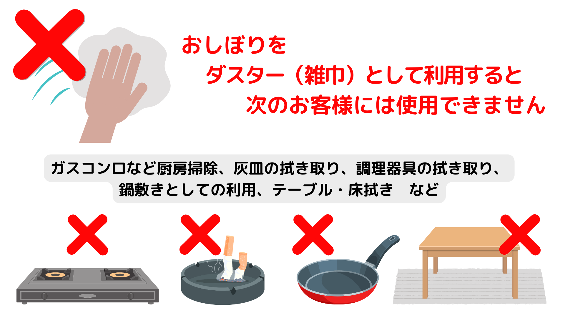 おしぼりはリユース商品であり、正しくお使いいただくことで、おしぼりの汚損・紛失料金は発生せず衛生的に繰り替えし使用ができる商品です。お客様のご協力により、現在の価格でおしぼりを提供することができております。今後ともご理解・ご協力のほどよろしくお願いいたします。