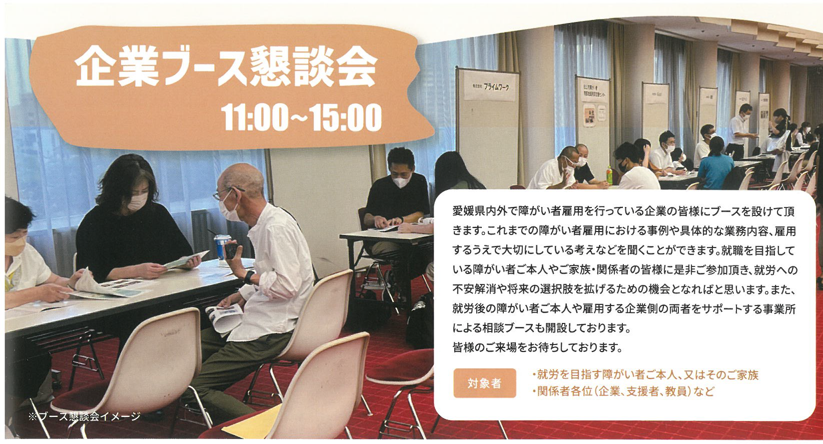 日時:2023年10月17日 場所:愛媛県県民文化会館 (真珠の間) 障がいのある人の就労における不安解消や将来への選択肢を拡げるためのイベント。 福祉事業・企業関係者など分野問わず、誰でも参加できる特別講演会と企業ブース懇談会を実施。 障がい者雇用経験のある講師・企業と話せる貴重な機会。 ご本人様、そのご家族などご参加お待ちしております。 特別講演会の申込はこちら 企業ブース懇談会の申込はこちら