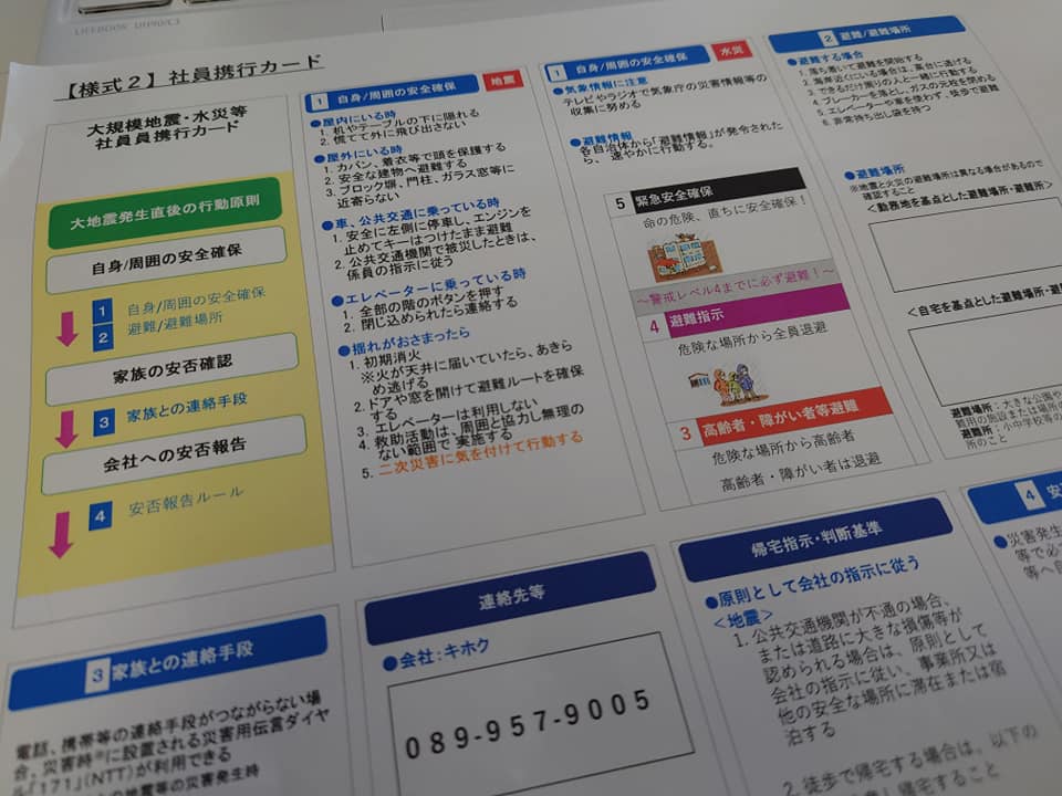 健康経営の取り組みとして BCP(事業継続計画)を策定しました。 防災・災害後の初動動作の確認・感染対策などについて社員と共有していきました。 【BCP理念】